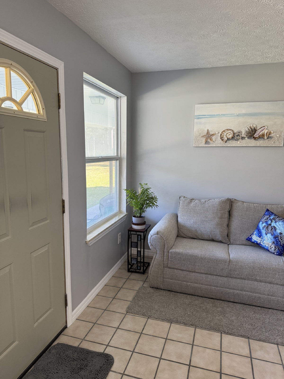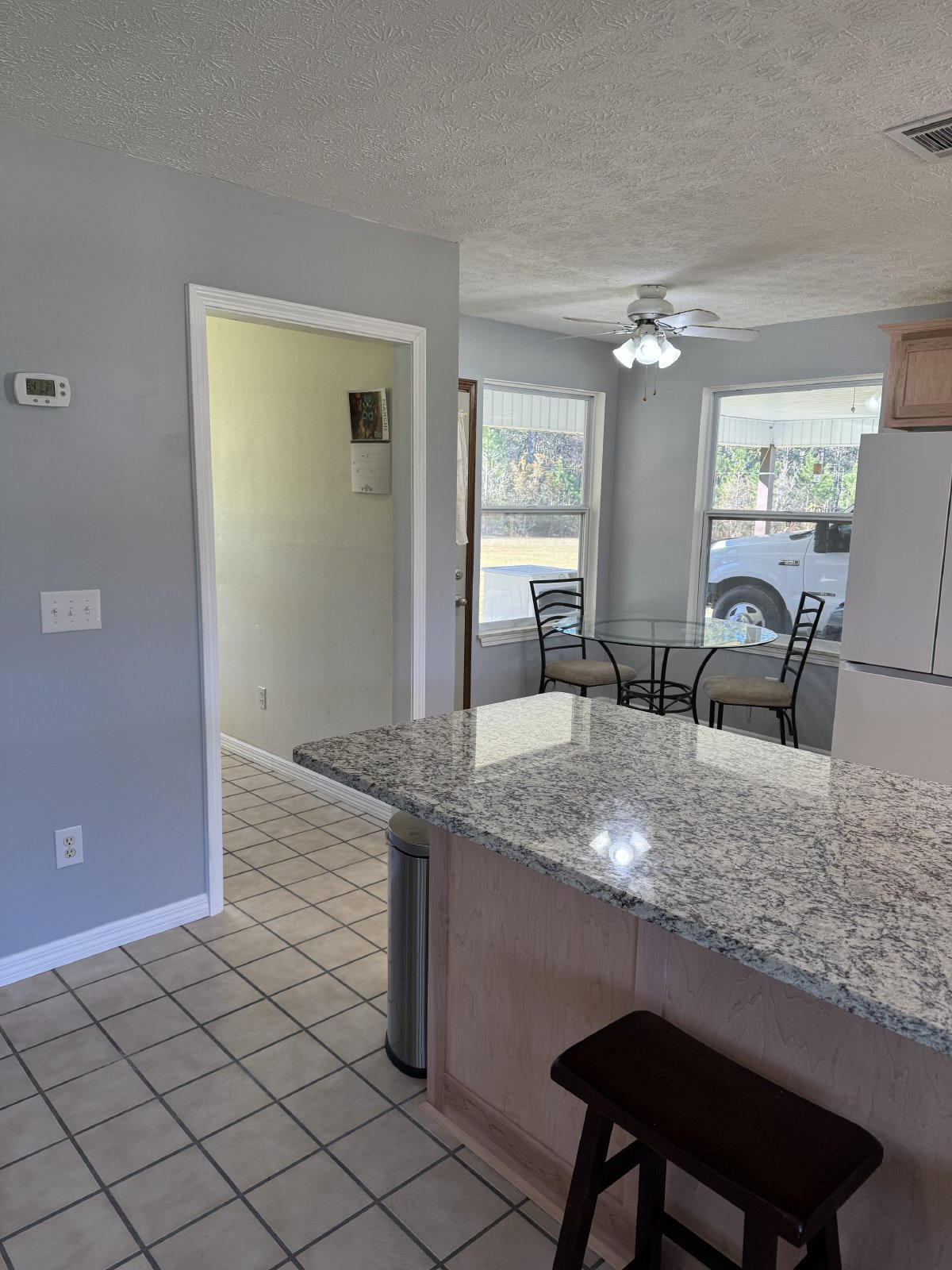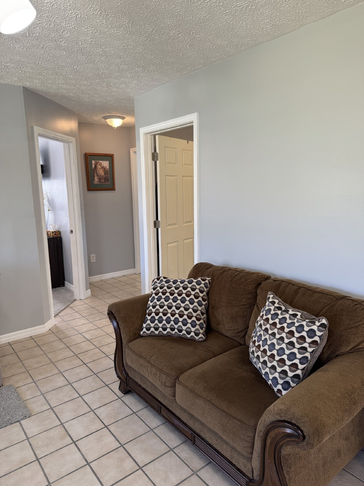 refrigerator, bottom-freezer, and dishwasher in the easily-cleaned, tiled kitchen. A spacious, partially furnished living room welcomes you, while the furnished master