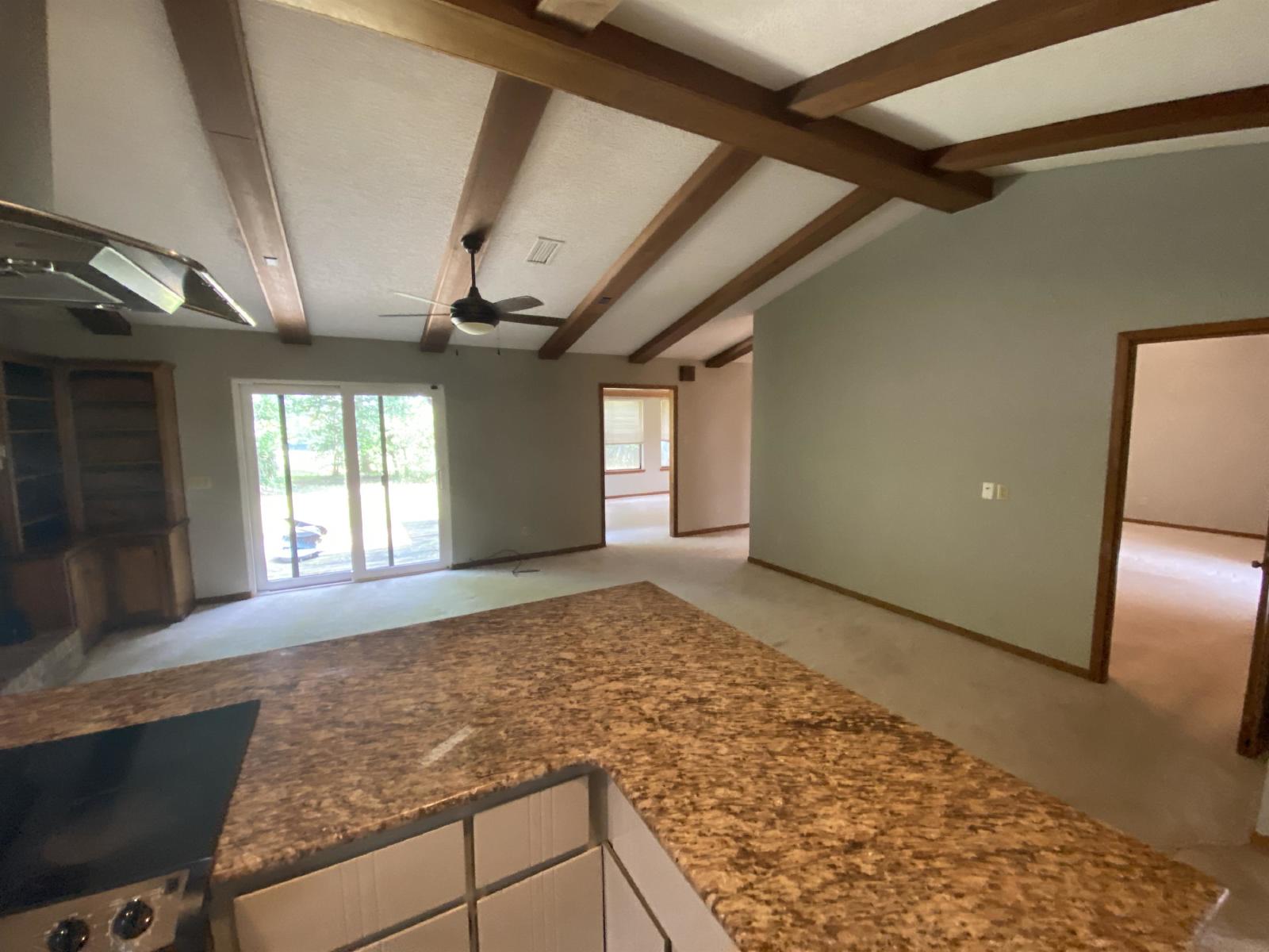 This gorgeous 4-bedroom, 3-bath, 2,805-square-foot brick home sits beneath beautiful shade trees and blends classic comfort with mid-century modern flair. Inside, a spacious living room with vaulted ceilings, exposed beams, and a wood-burning fireplace creates an inviting centerpiece for daily living.