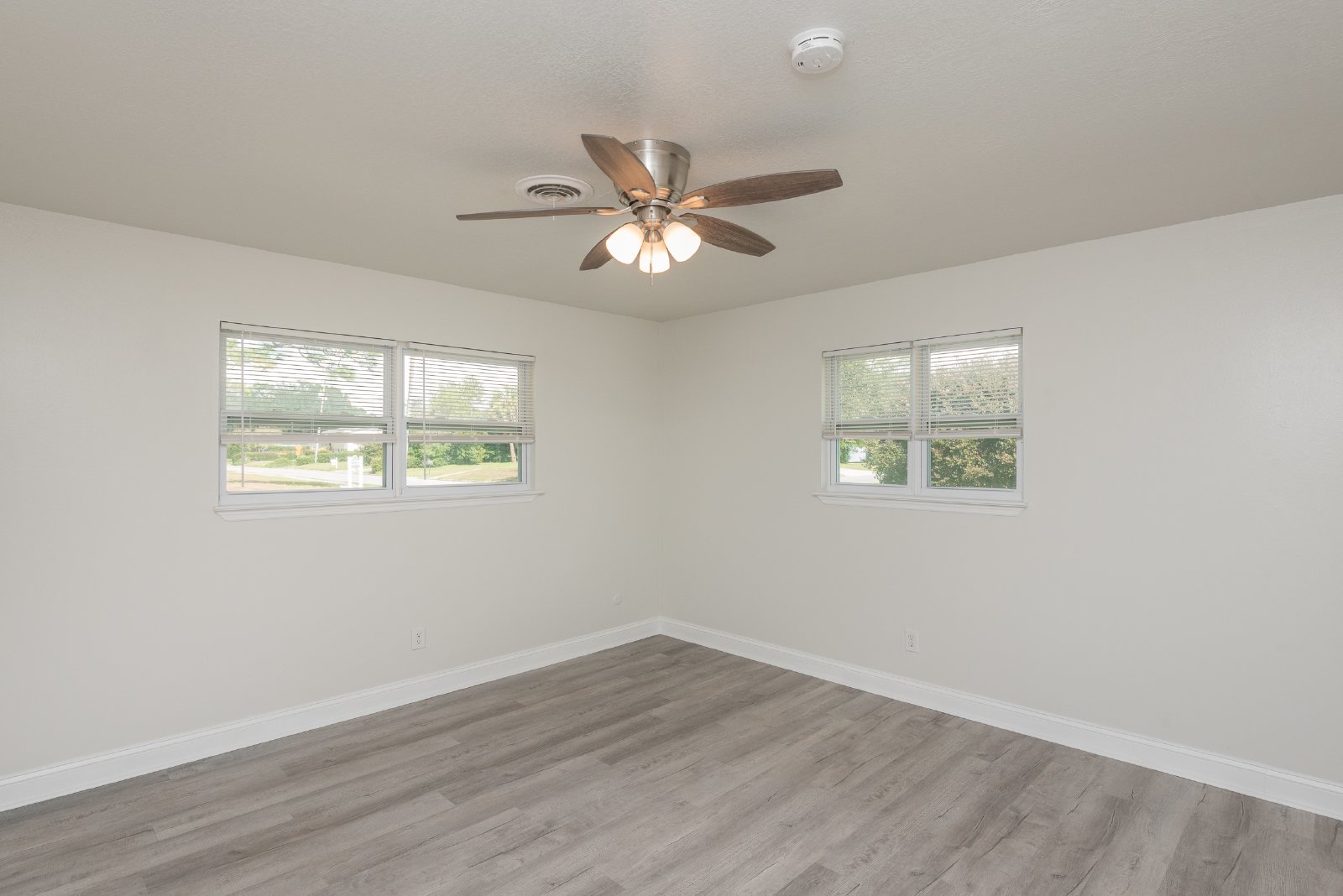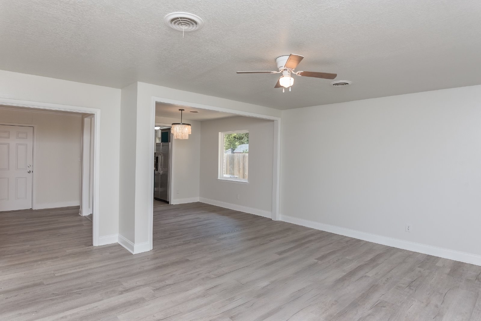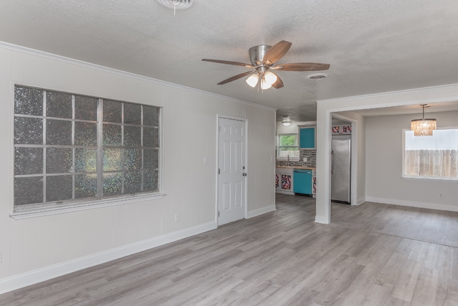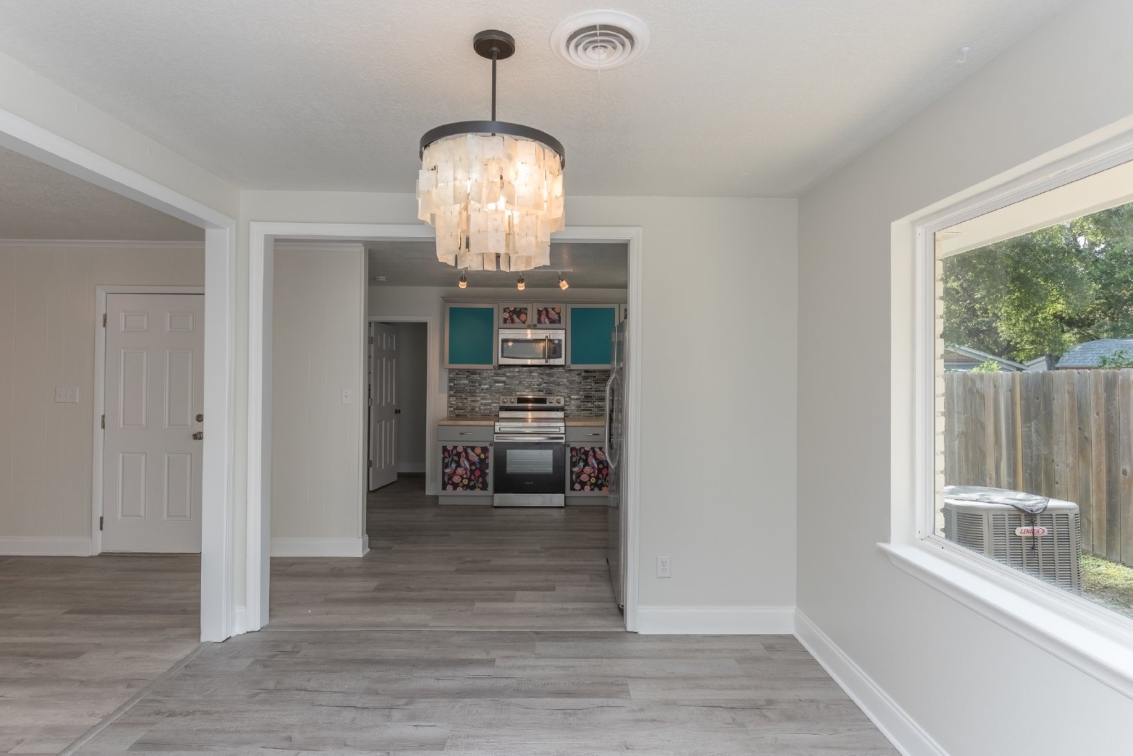 Inside, the bright and open layout flows easily from the living area into the dining space and kitchen, creating a warm, inviting atmosphere. Durable LVP flooring, a fun chandelier, and a mid-century modern fireplace add both style and character to the main living area.
