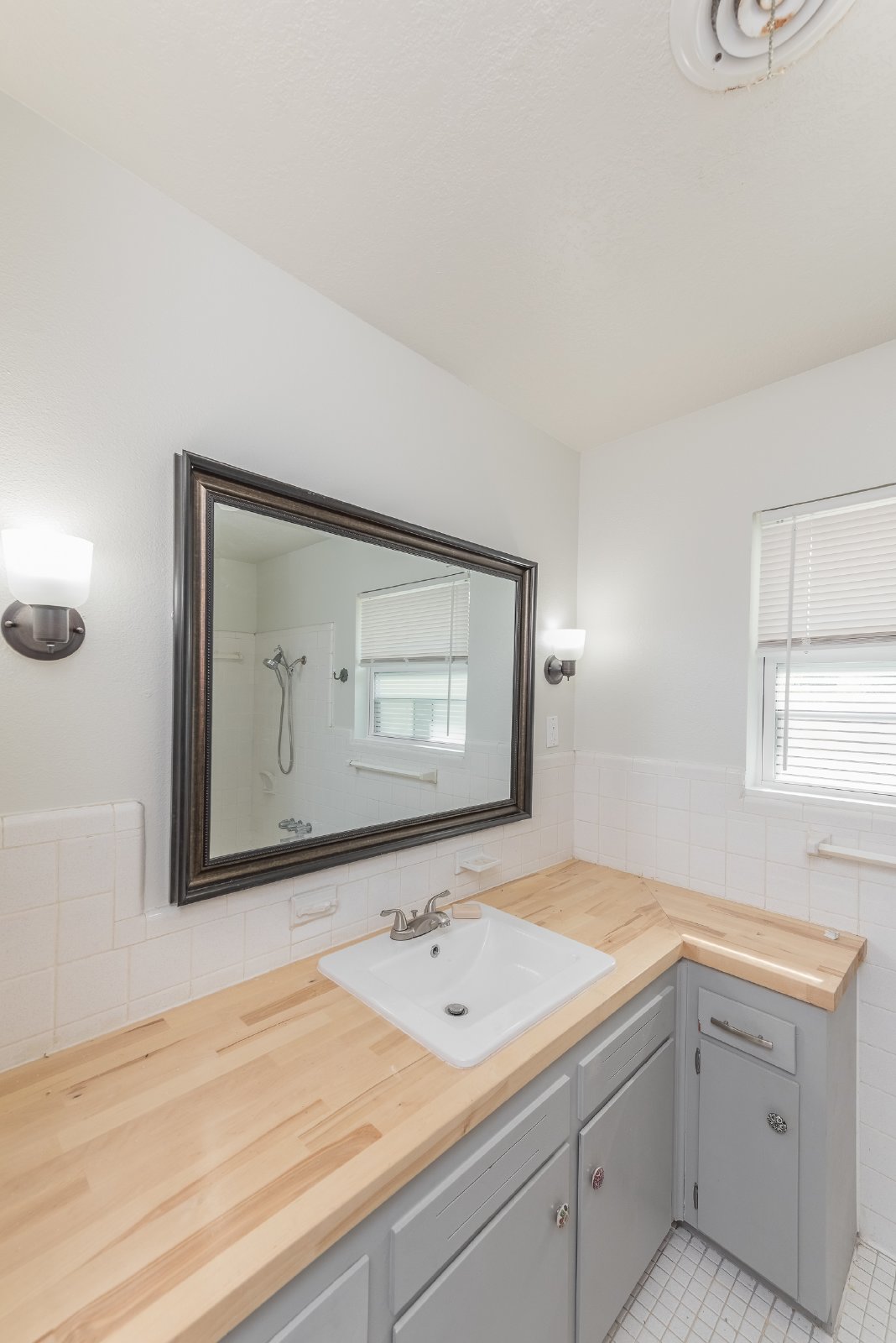 The kitchen has a cheerful, modern vibe with butcher block counters, stainless steel appliances, and plenty of cabinet space. Both bathrooms are updated and fresh, including a beautifully refinished bath with turquoise tile that nods to the home's retro roots.